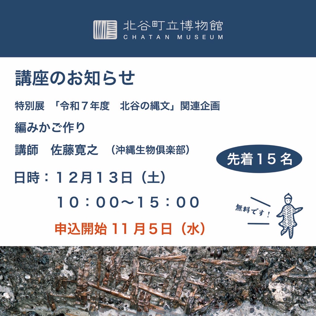 特別展「北谷の縄文」 航 〜交流のはじまり〜 の関連企画で講座を行います。遥か数千年前の縄文時代に完成されていた編みの技術を用いて編みかご(クラフトテープ製)作りを行います。