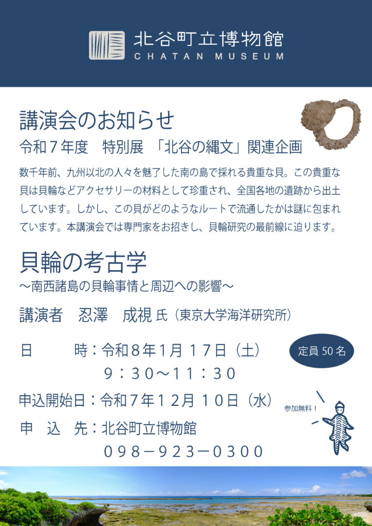 貝輪の考古学 ~南西諸島の貝輪事情と周辺への影響~日時:令和8年1月17日(土)9:30~11:30講演者:忍澤 成視(東京大学海洋研究所)定員:50名料金:無料申込先:北谷町立博物館 098-923-0300