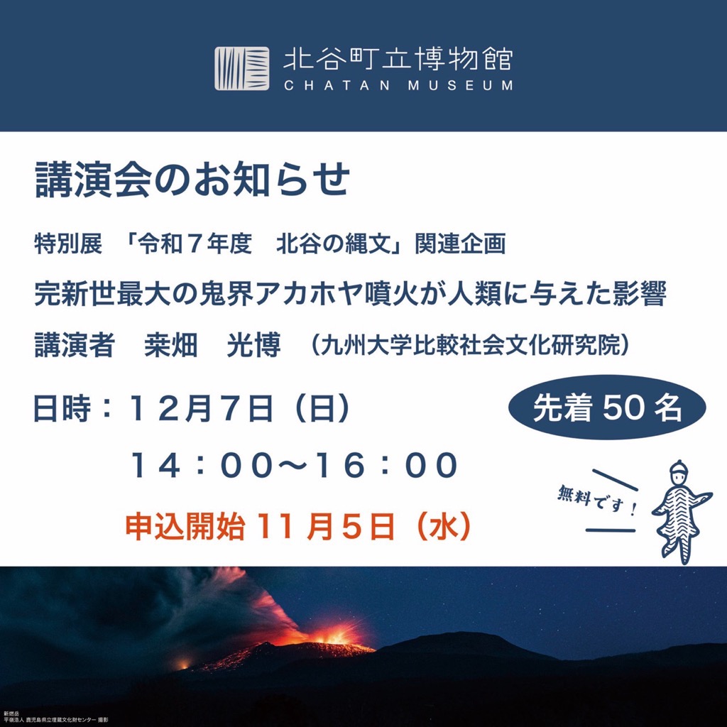 特別展「北谷の縄文」 航 〜交流のはじまり〜 の関連企画で講演会を行います。「完新世最大の鬼界アカホヤ噴火が人類に与えた影響」日時:12月7日(日)14:00~16:00講演者:桒畑 光博(九州大学比較社会文化研究院)定員:50名(先着)料金:無料申込先:北谷町立博物館 098-923-0300